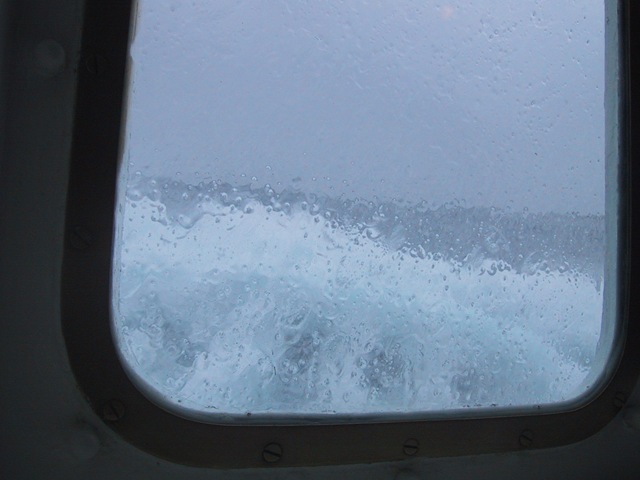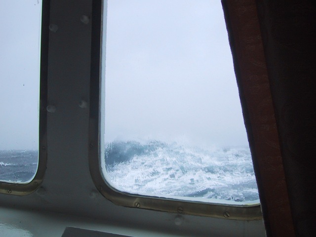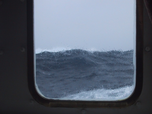 They were between the Drake Passage, which is the stormiest water in the world, and the Antarctic Peninsula, which is much more sheltered.  The seas could have been much rougher.  We went through two Force 10 gales getting to and from Antarctica, which means 30 foot seas and 60 mile-per-hour winds.  These photos don’t really do it justice but they were taken from the square windows above the red stripe on the hull and the waves are at or above the same level:
