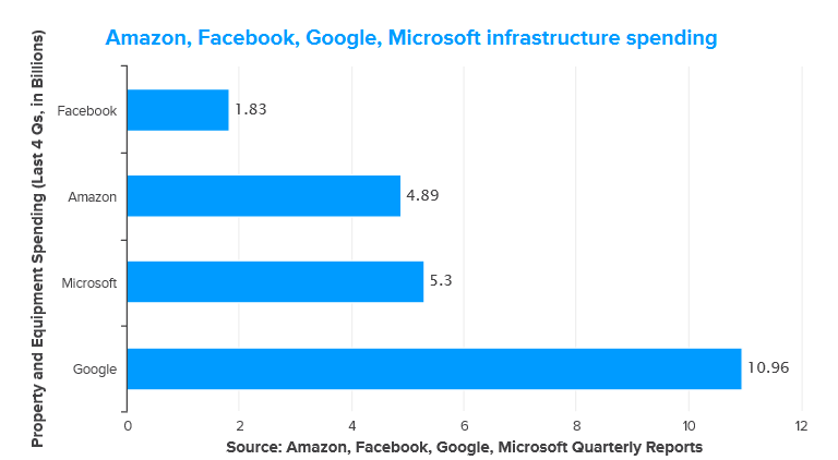 Now these numbers aren’t pure apples to apples comparisons. Amazon’s capex also goes to erect even more cavernous e-commerce distribution centers with “more than 15,000 robots in 10 fulfillment centers across the U.S.” Google and Microsoft both spend big on search infrastructure, and Google’s numbers include YouTube, flotillas of automotive, sea-going, aerial and space-faring vehicles, and based on the sheer magnitude, maybe the odd space elevator.