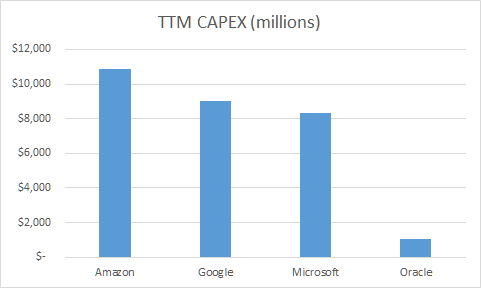 To play in cloud infrastructure, especially to serve Oracle’s enterprise customer base, requires a vast infrastructure investment in a global footprint of datacenters and networks, which in turn requires many billions of dollars in capital expenditures. When we compare Oracle’s expenditures over the last twelve months with the companies they claim to be competing with, it is hard to discern any commitment to building out a competitive infrastructure: