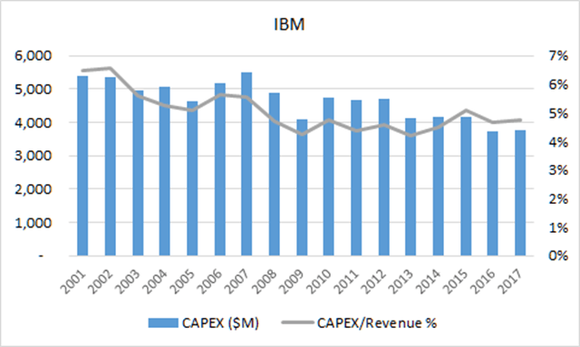 Amazon, Google and Microsoft all have non-trivial hardware businesses (Echo, HTC/Pixel, Surface, HoloLens, etc.) as well that consume CAPEX. You can see how much Oracle managed to squeeze the CAPEX they inherited from Sun, so don’t think they have a lot. What IBM spends all that CAPEX on is a mystery, but pretty sure it is in’t data centers.