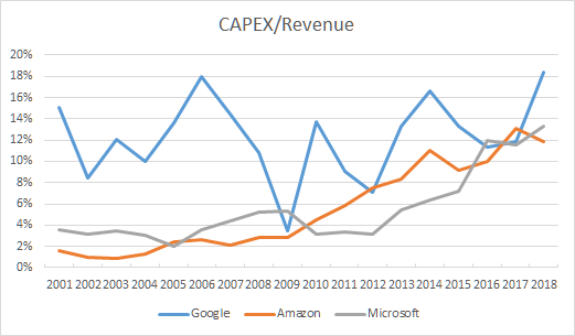 After being almost identical last year, we see a big spike in CAPEX as a percentage of revenue at Google to over 18%.