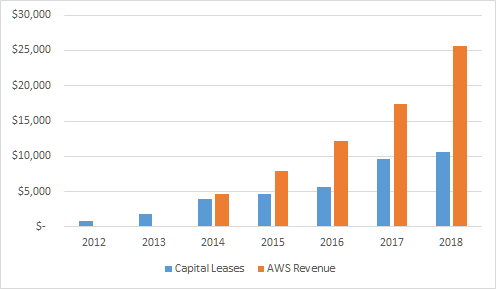We can compare the capital lease expenditures and AWS revenues, and the numbers line up reasonably well: